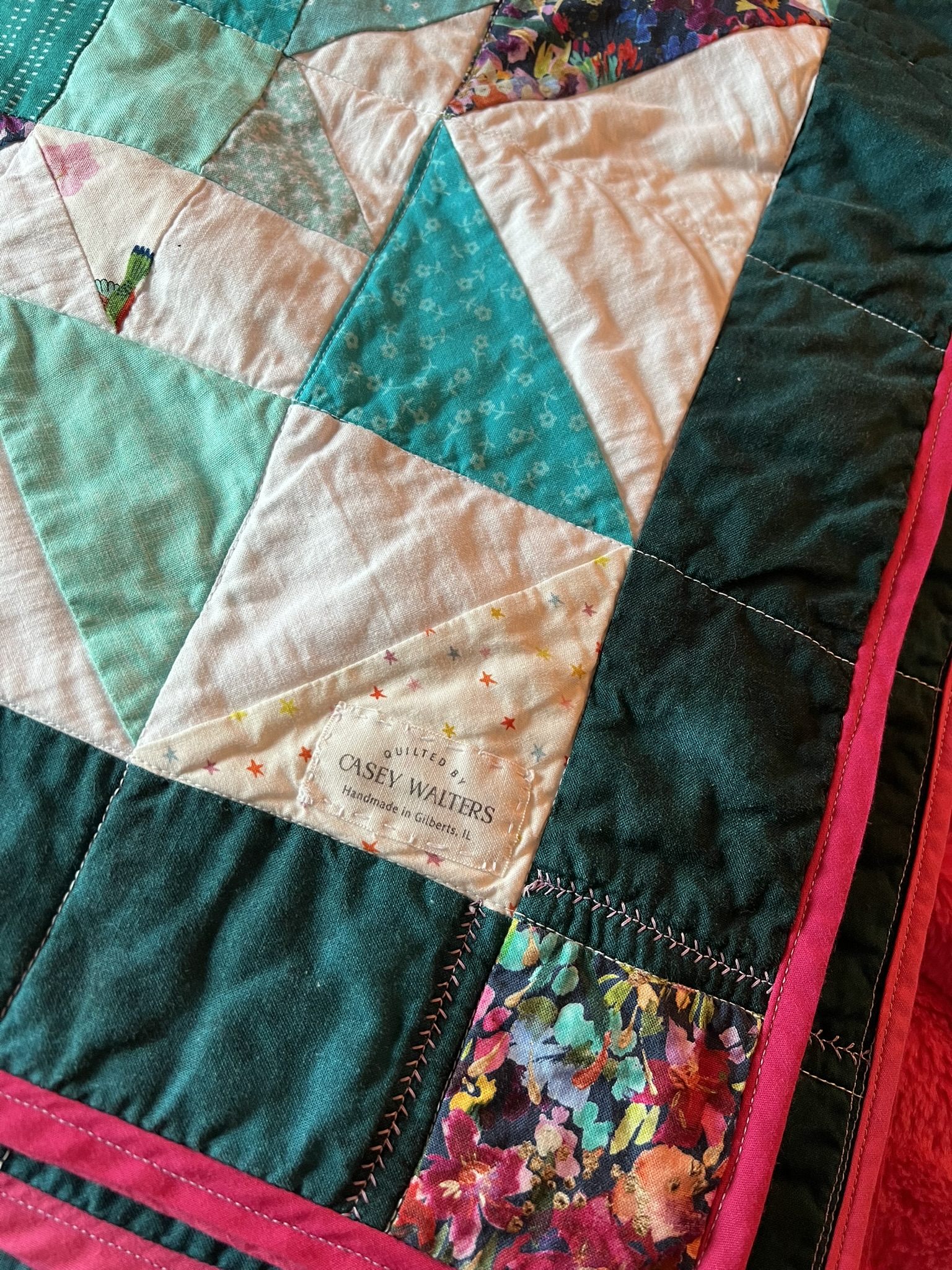 I quilted this one myself. I used the 'stitch in the ditch' method. I bought some bia tape from Hobby Lobby to use as binding, and I think the color matches perfectly. I also hate making my own binding, so this was a win for me.