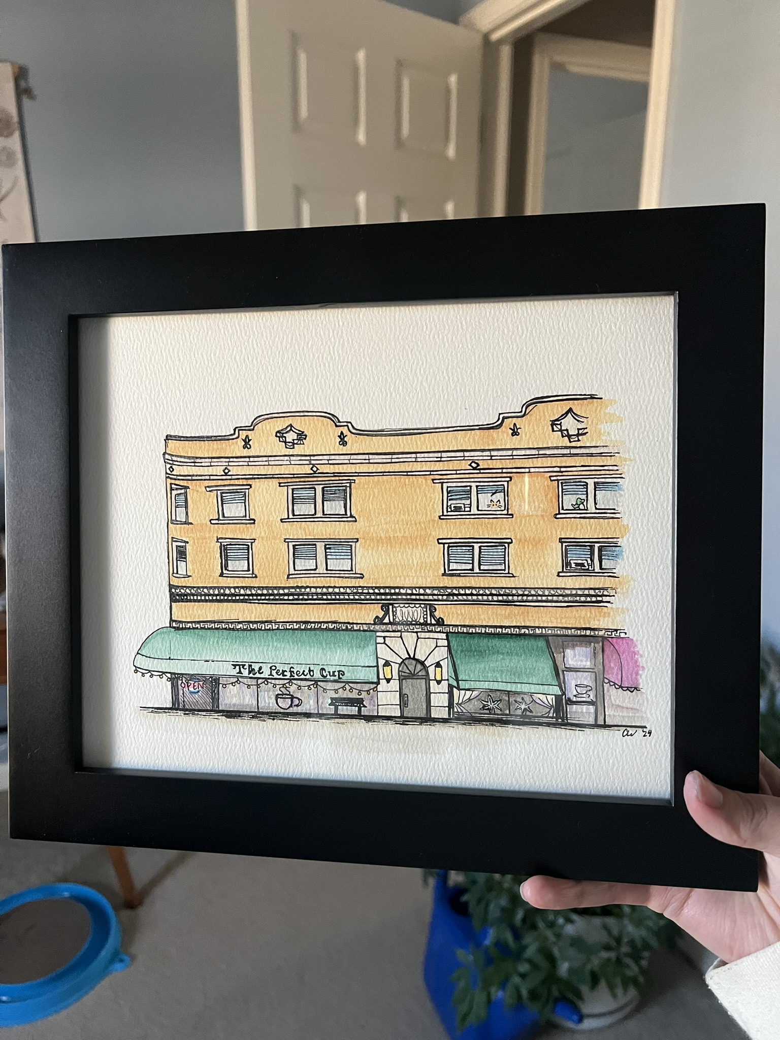 pen on paper drawing of 4702 N Damen Ave, Chicago IL. Watercolor added. 2024.