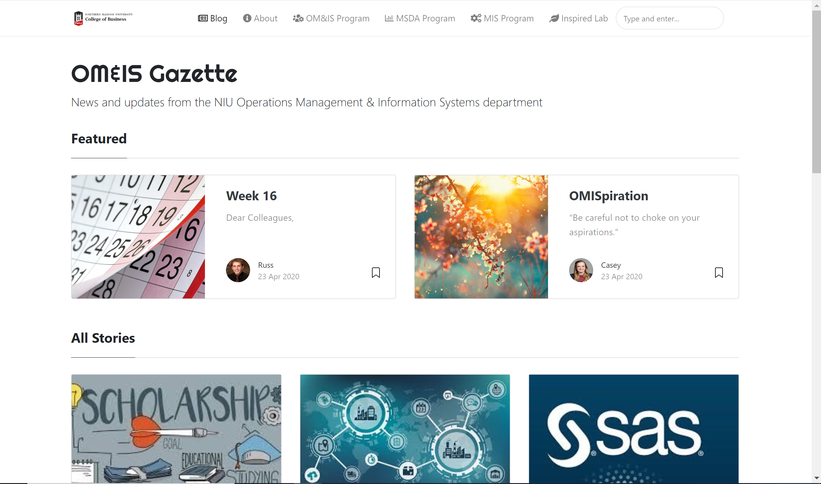 While earning my masters degree, I worked as a graduate assistant for the Operations Management and Informations Systems (OM&IS) department at Northern Illinois University. I replaced the old department email newsletter with this static news-style website. I was sent countless emails detailing internship/job opportunities, campus job fairs, and other various OMIS related events, and posted them as articles.