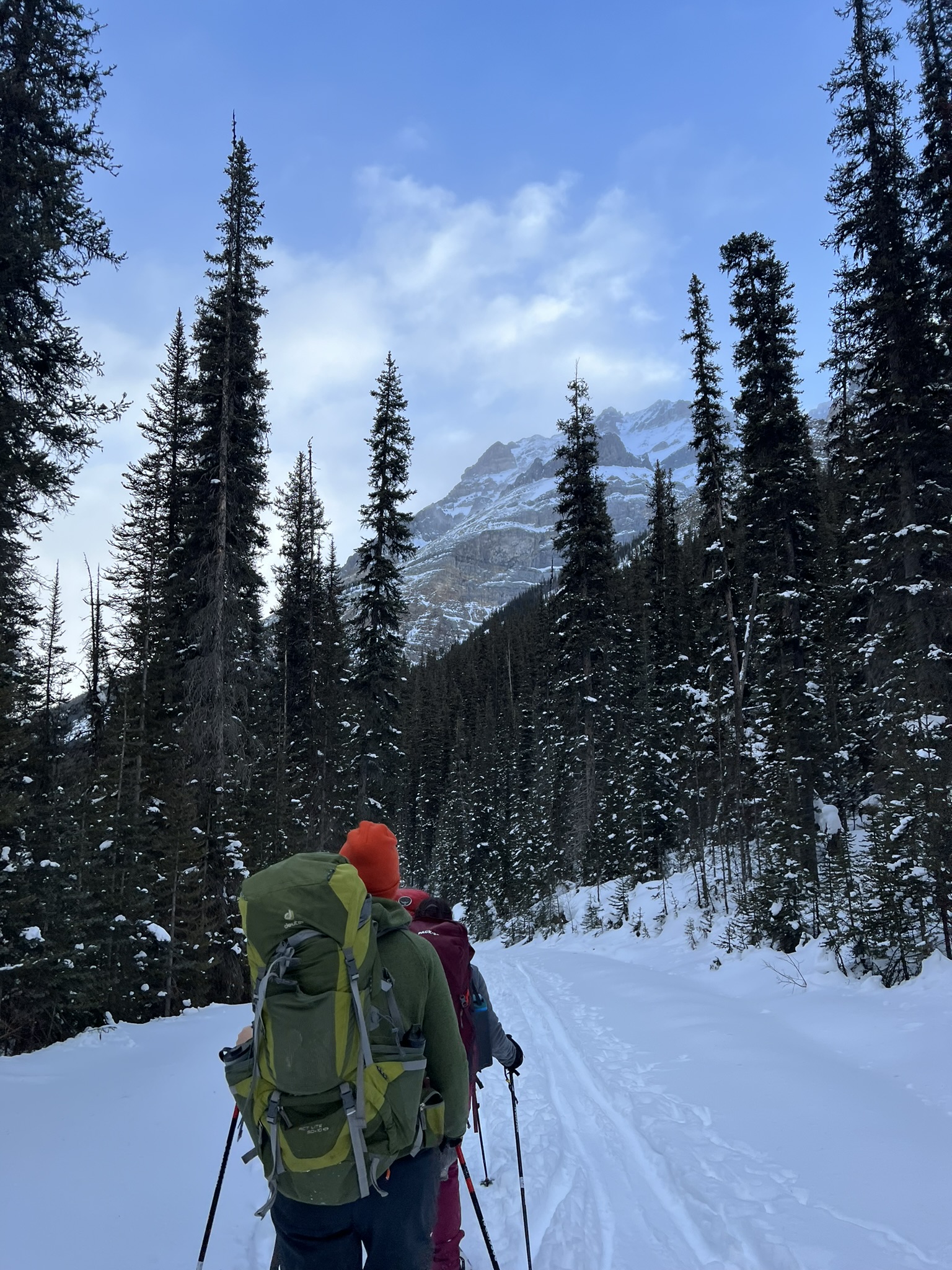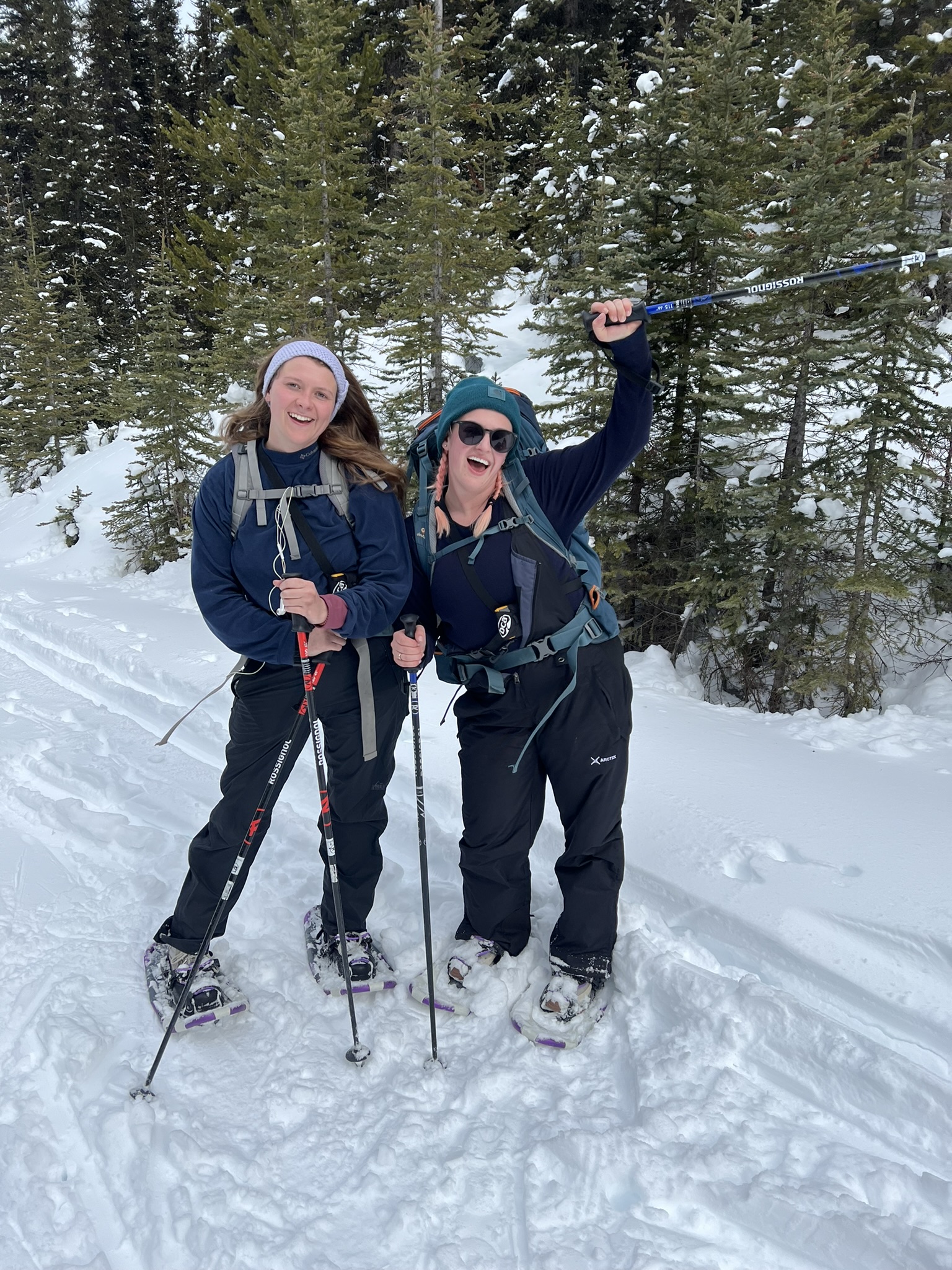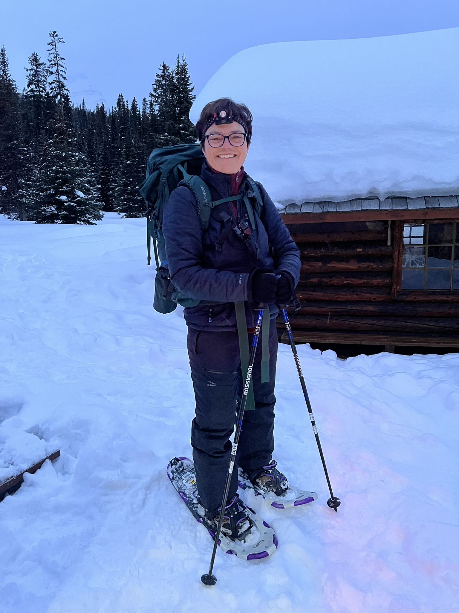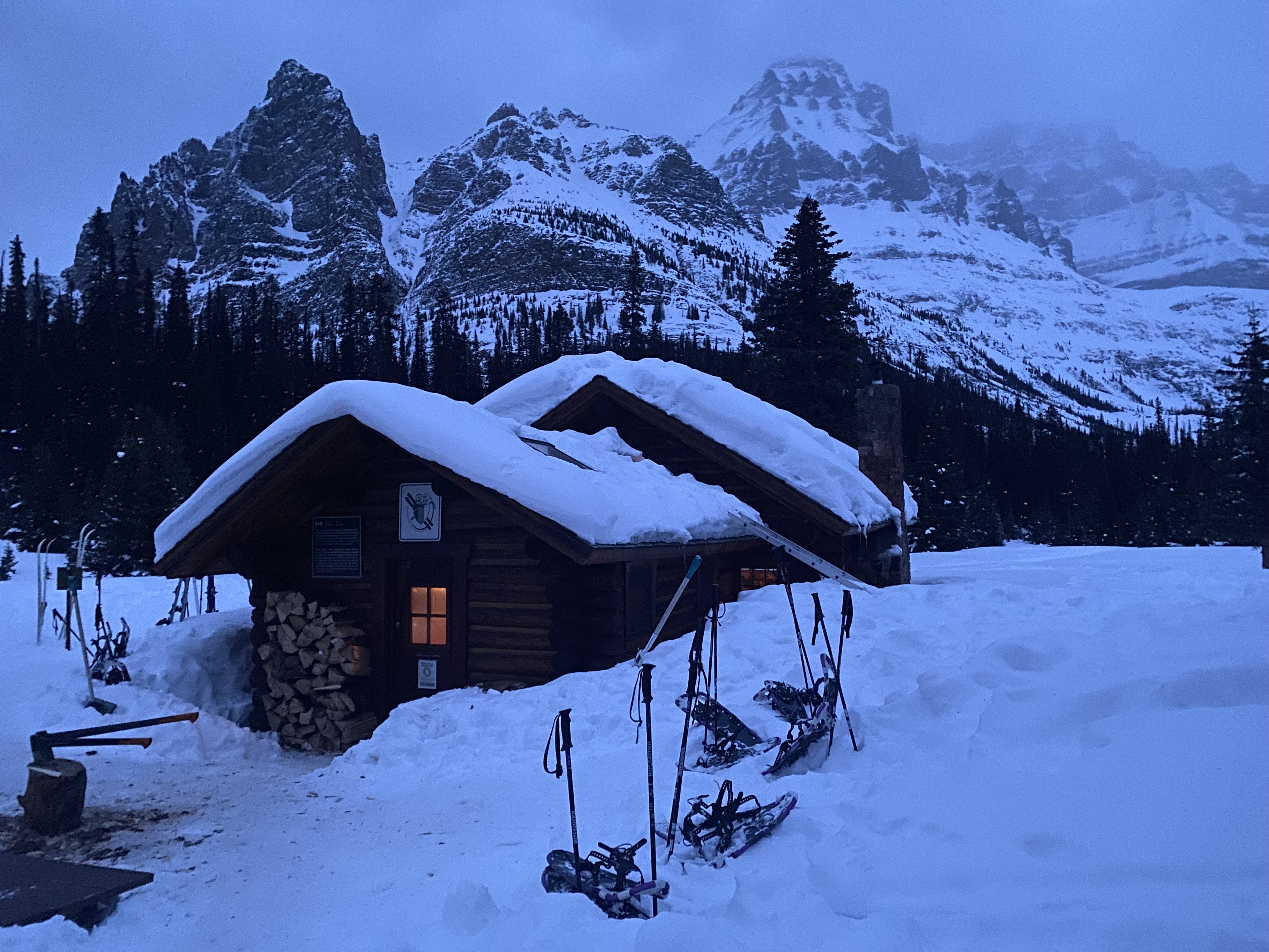 We showshoed 7 miles to the Elizabeth Parker hut in Yoho National Park for an overnight stay. The hut is only accessible by foot or ski in the winter, and is stocked with firewood, cooking supplies, and sleeping mats. It was cozy and warm inside!