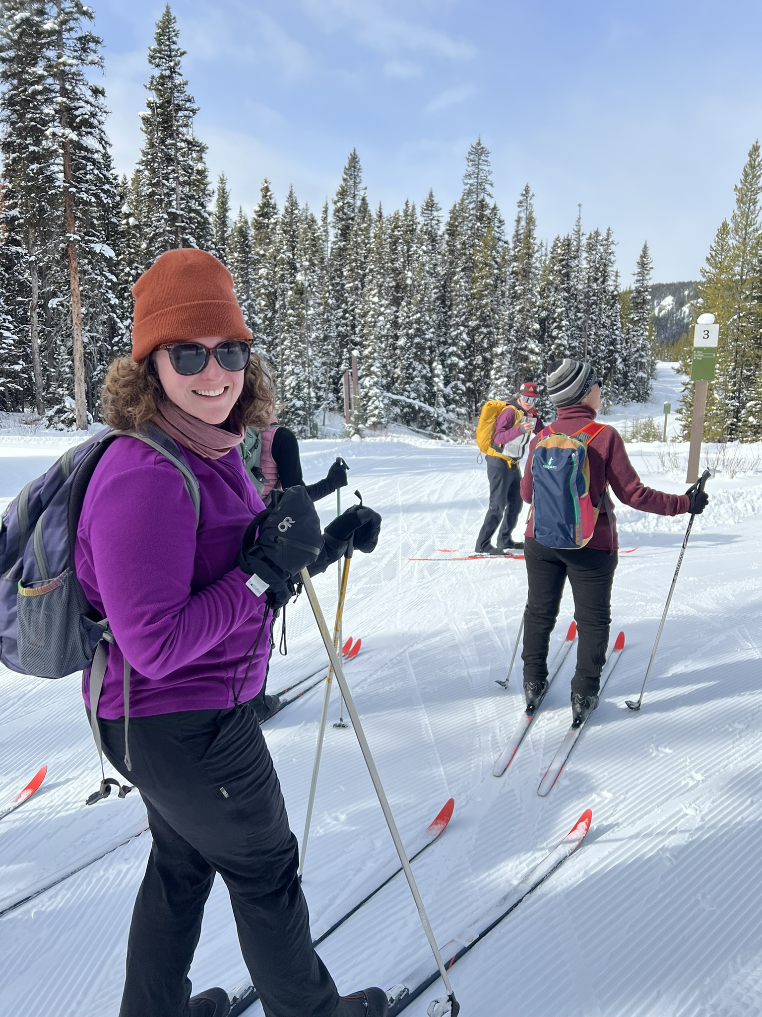 Sarah and friends in cross country skis, trying to decide on a trail.