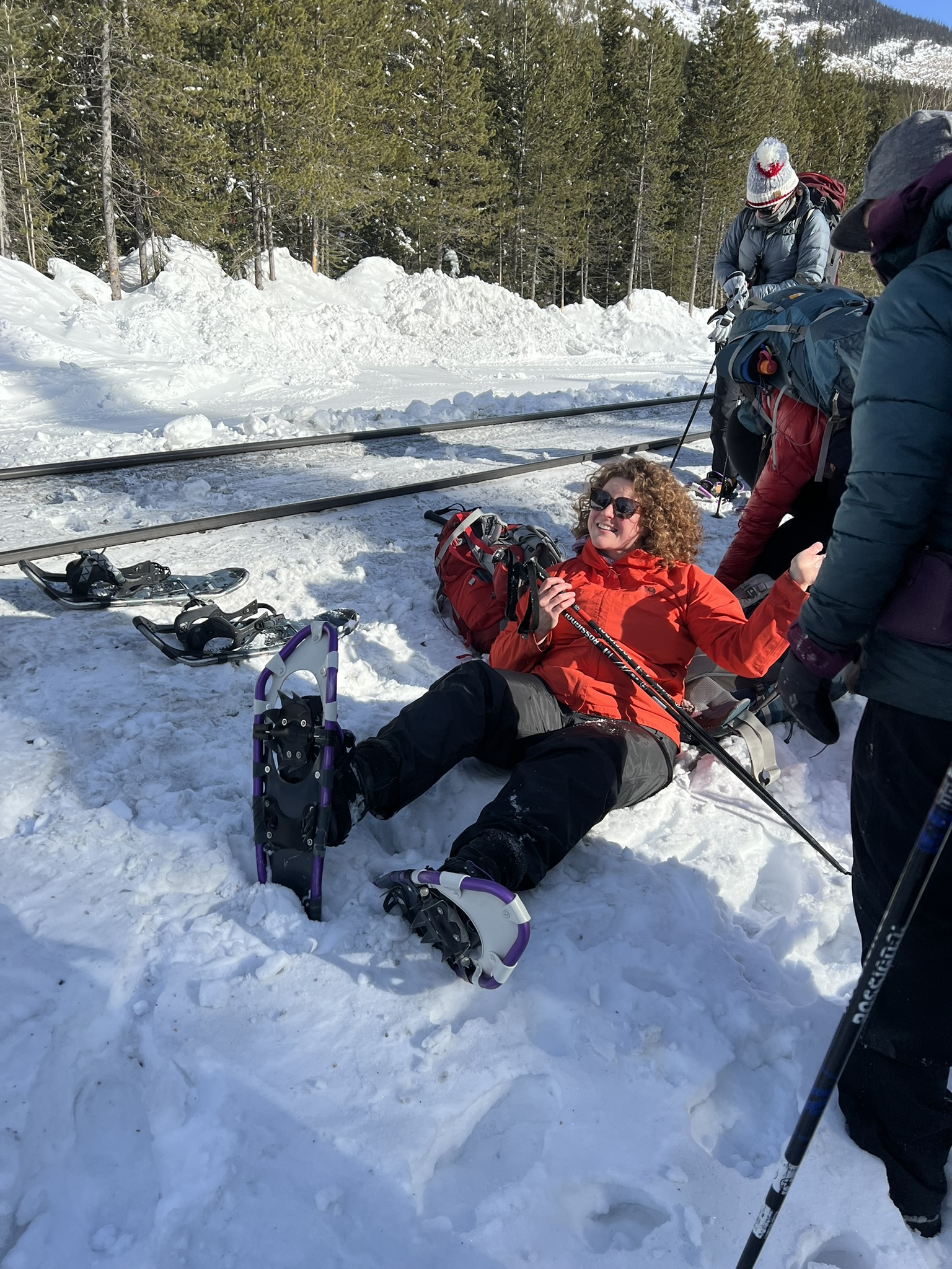 A train was stalled on the tracks, about a mile from our trailhead. We crossed the tracks, and had to strap on our shoes right there!