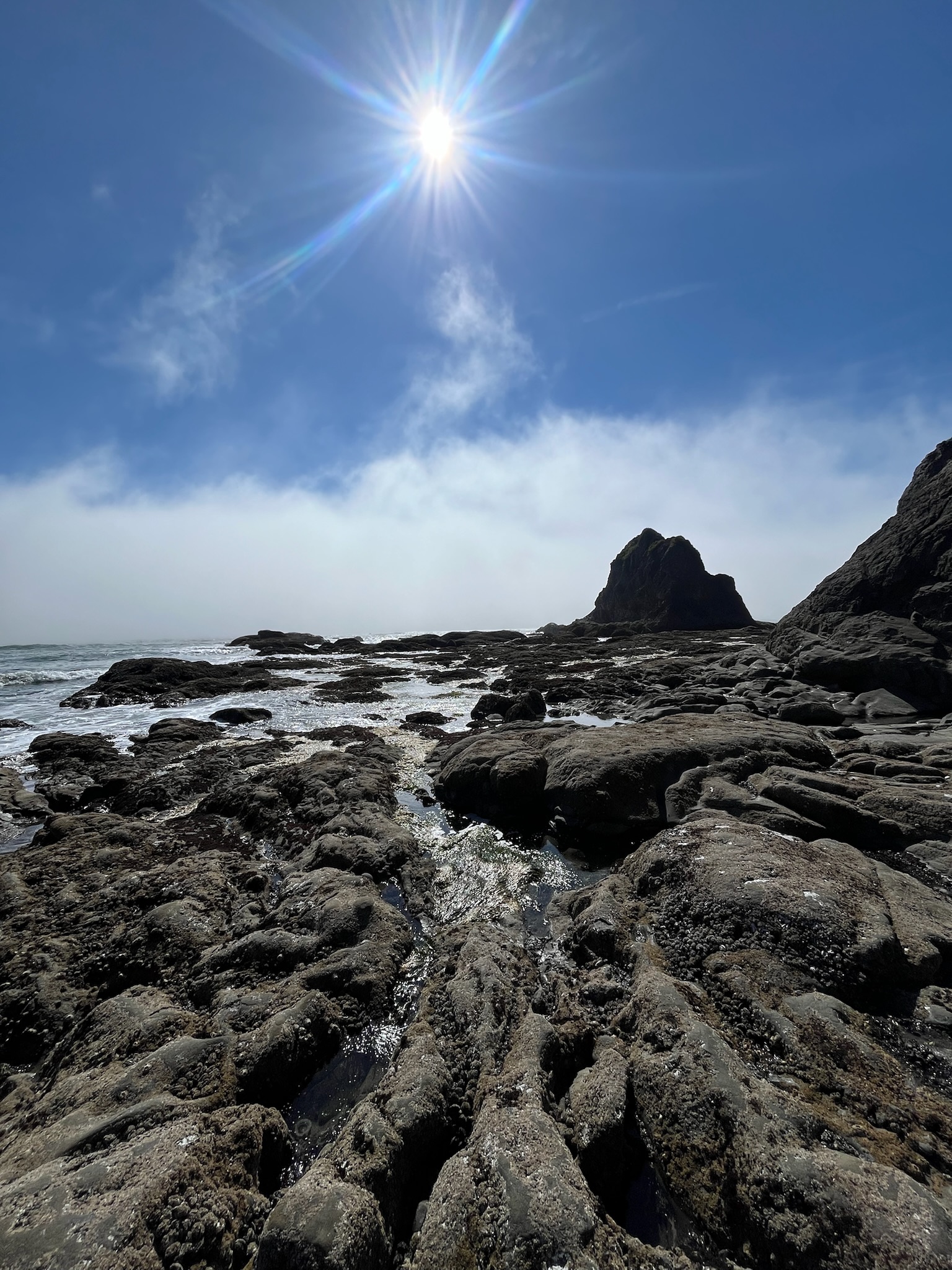 Elisa navigating her way through "Hole in the Wall" rock formation at La Push beach, to get to our backpacking campsite.